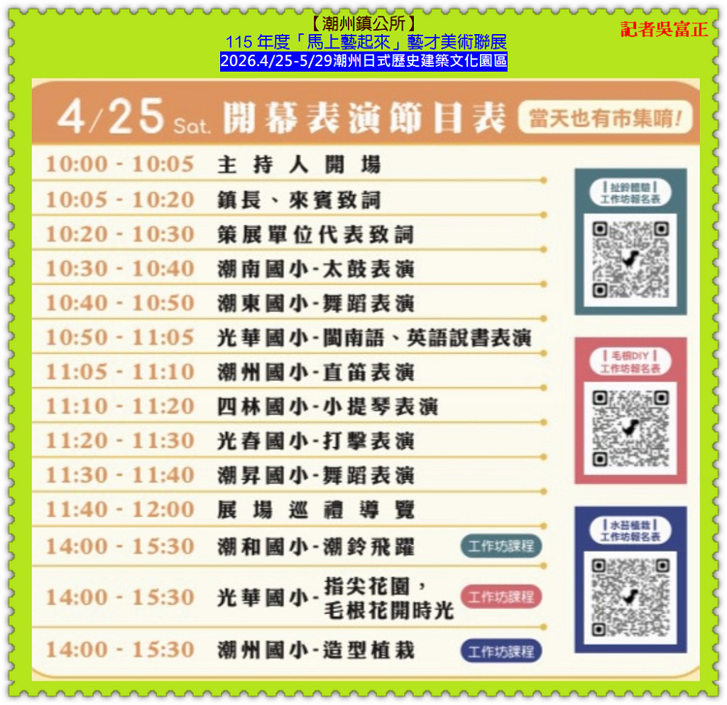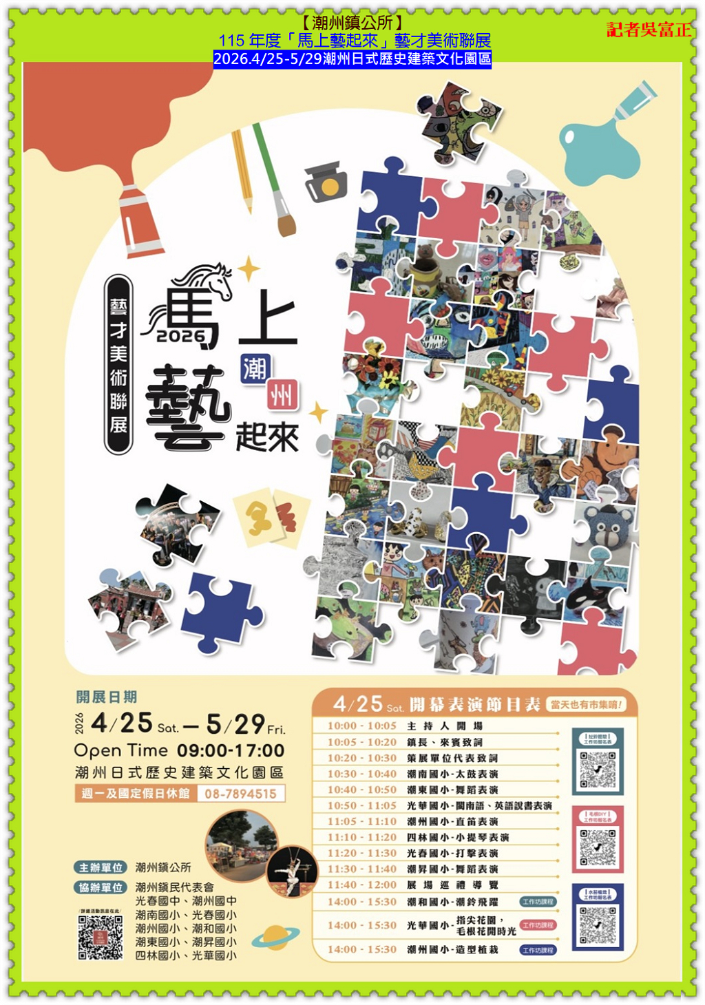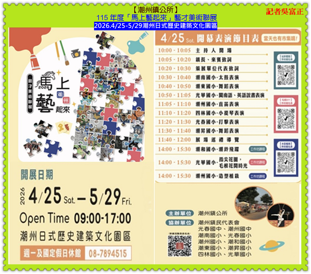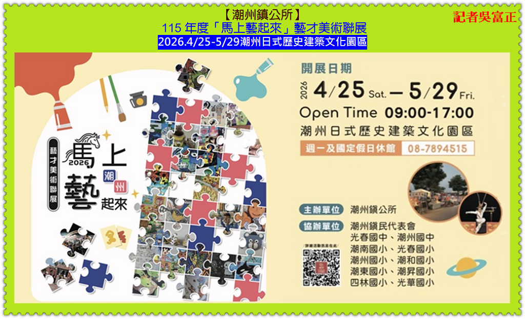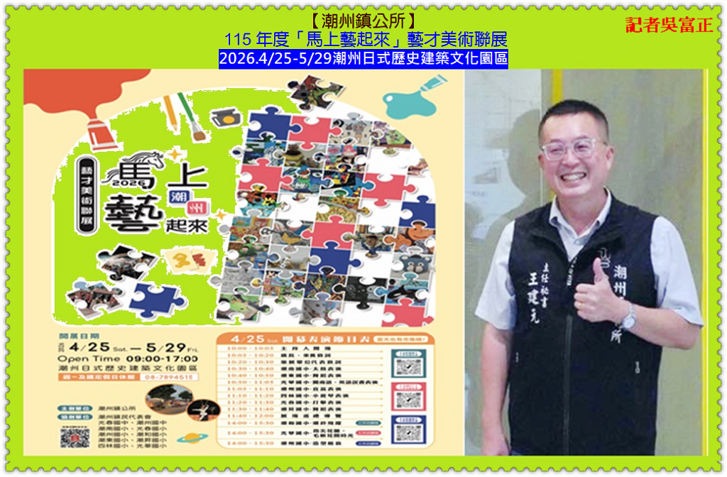 【潮州鎮公所】2026.4/25至5/29在「潮州日式歷史建築文化園區」展開 115 年度「馬上藝起來」藝才美術聯展;【潮州鎮公所】王建元主秘表示,盛事橫跨鎮內光春國中、潮州國中、光春國小、潮州國小、潮和國小、潮南國小、潮東國小、潮昇國小、四林國小、光華國小10 所中小學,將校園純粹的創作靈魂注入百年古蹟,這不僅是一場美展,更是透過「地方文化館」作為資源樞紐,成功鏈結文化部社造計畫與教育部美感教育。4/25開幕當日更擴大結合「潮藝文創市集」與「免費手作工坊」,將歷史場域轉化為連結校園、社區與回鄉青年的「無牆美育教室」。