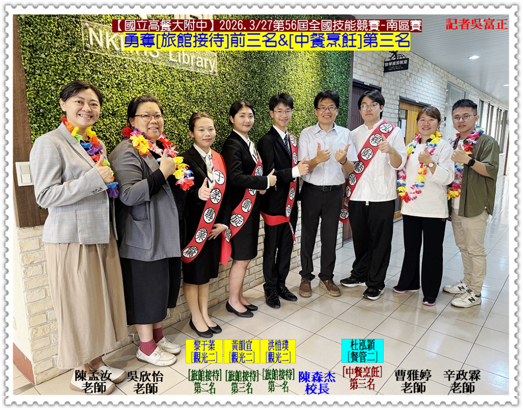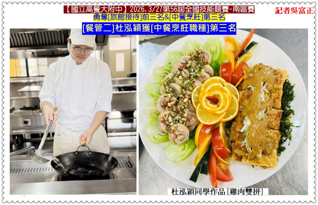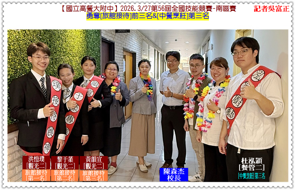 【國立高餐大附中】參加2026.3/27「第56屆全國技能競賽-南區賽」,[旅館接待職種]由觀光二/洪愷璞獲第一名、觀光二/黎于葇獲第二名、觀光二/黃韻宣獲第三名餐管二/杜泓穎獲[中餐烹飪職種]第三名