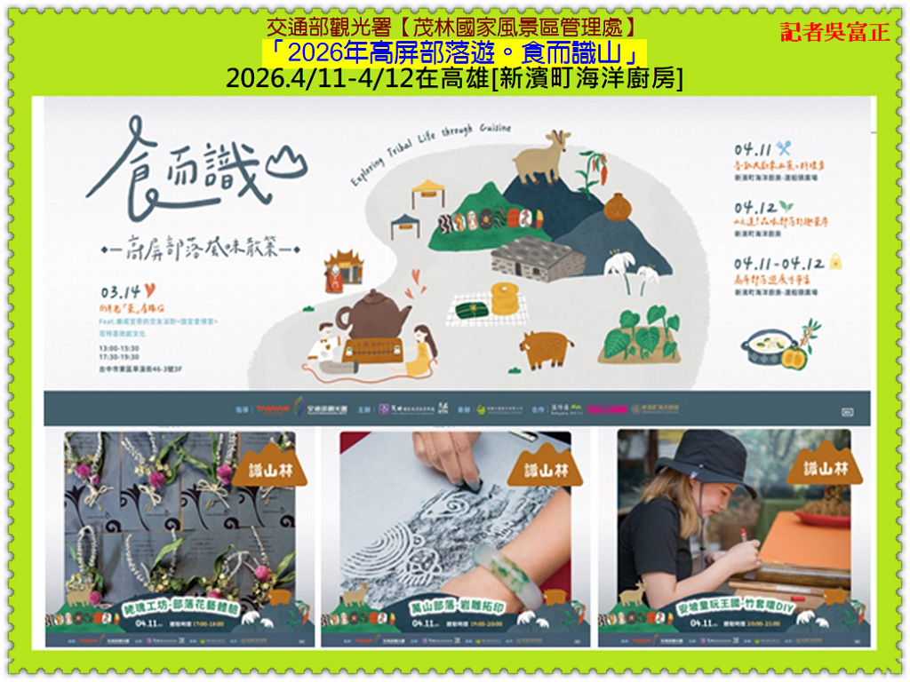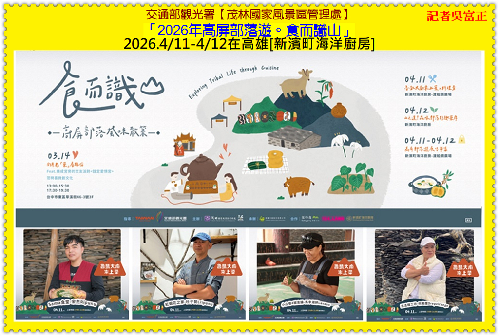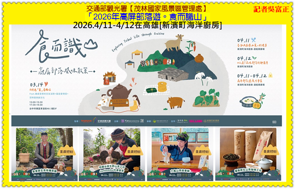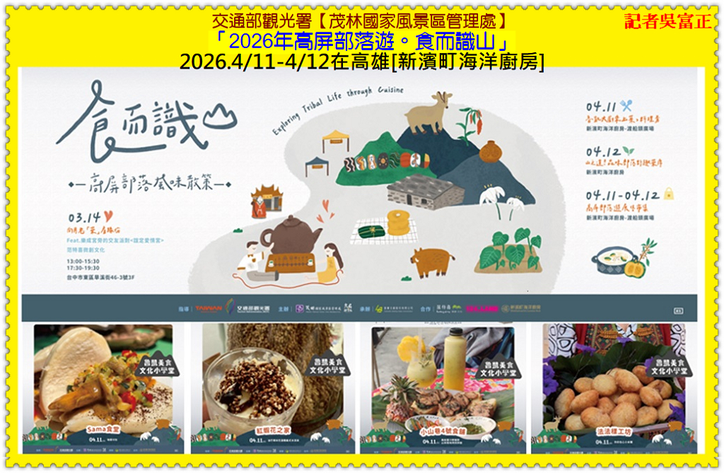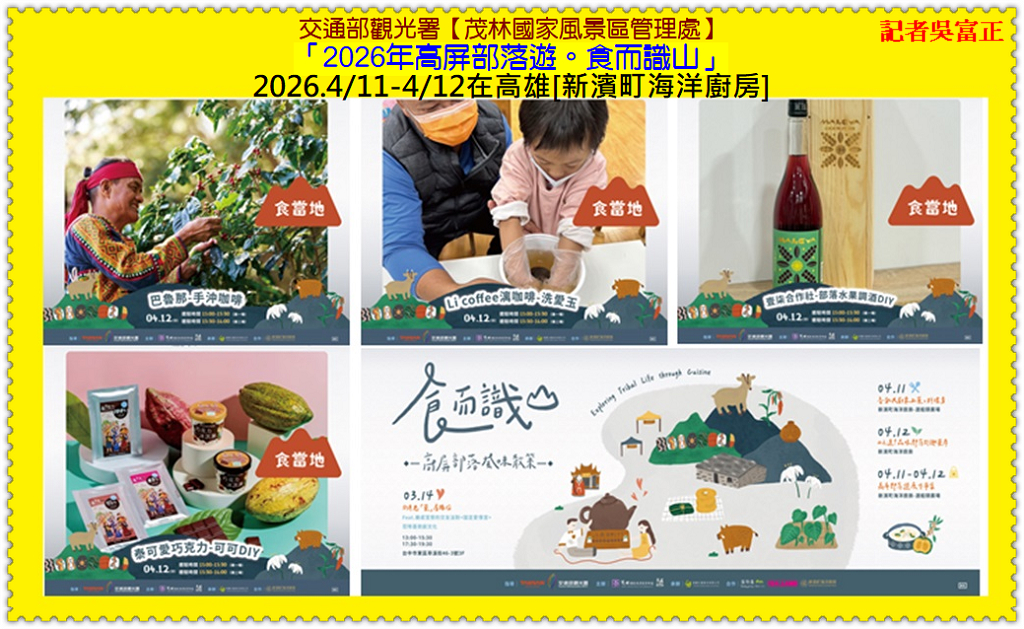 交通部觀光署【茂林國家風景區管理處(茂管處)】為推動高屏部落觀光,2026.4/11-4/12在高雄[新濱町海洋廚房]舉辦「2026年高屏部落遊。食而識山」品牌活動,本次以「食」為主軸,將部落與土地共生的飲食文化帶入都會場域,透過味覺體驗引領民眾走訪茂林國家風景區轄內高屏部落,深度體驗原鄉風土魅力。